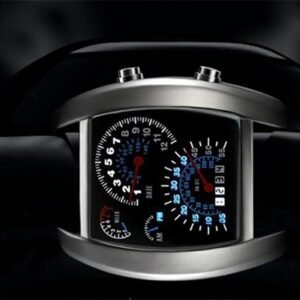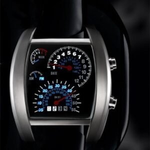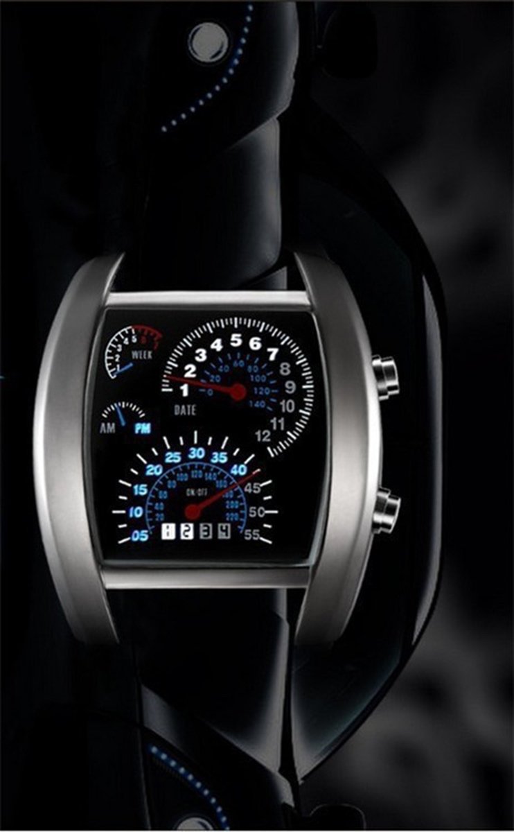 Un HIT absolut! Afișează data și ora folosind o imitație a ceasurilor mașinii. Lumina de fundal albastră contrastează perfect cu fața neagră a ceasului. Datorită utilizării tehnologiei LED de economisire a energiei, ceasul nu necesită schimbări frecvente ale bateriei. Un cadou grozav pentru fiecare iubitor de două și patru roți!
