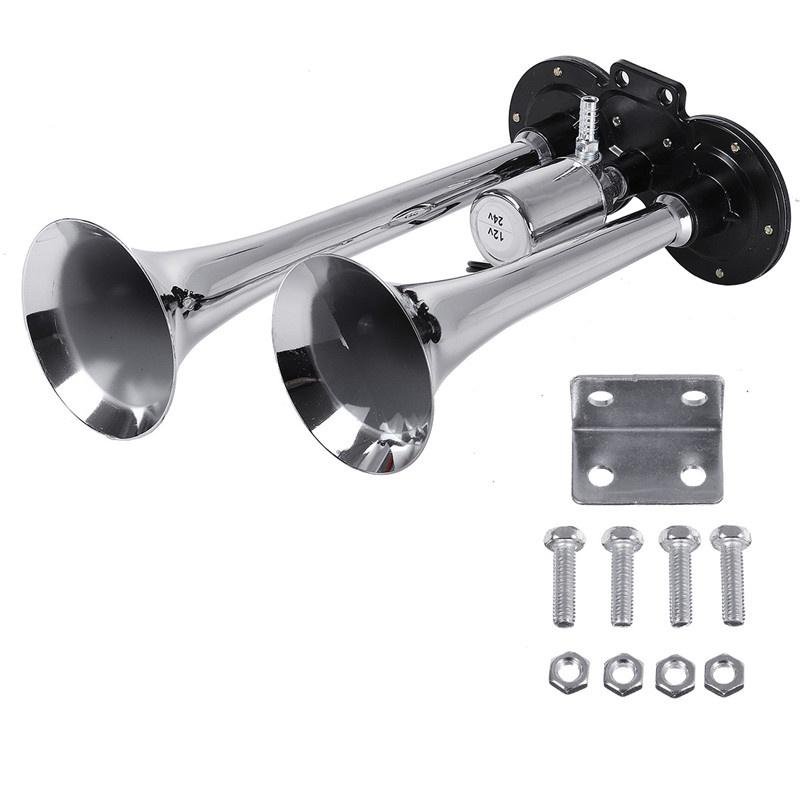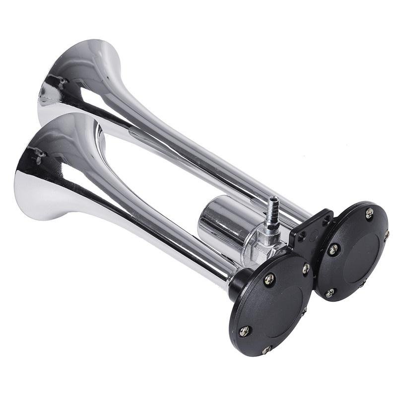 Claxon bitonal cu 2 goarne, alimentare 12/24V pentru vehiculele dotate cu compresor de aer, culoare Crom/Negru