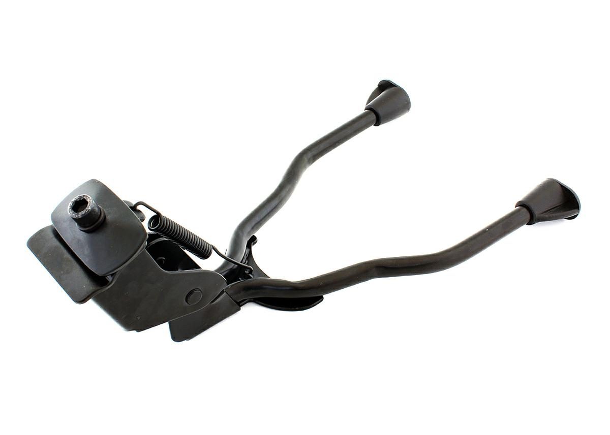 Un suport metalic, dublu pentru biciclete, conceput pentru montarea între roata din spate a unei biciclete. Fixat cu un șurub în mod standard. Piciorul are tampoane anti-alunecare și un arc puternic. Picioarele duble oferă mult mai multă stabilitate decât picioarele standard! Setul include un distanțier suplimentar care protejează cadrul bicicletei de zgârieturi.