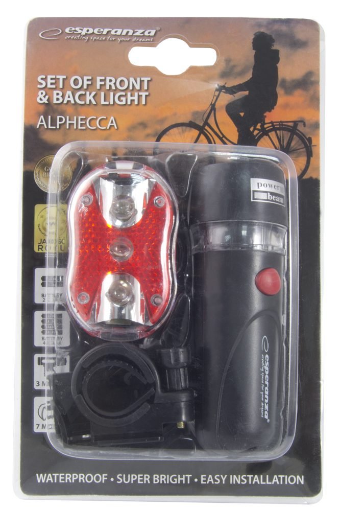 Un set de lămpi pentru biciclete Esperanza ALPHECCA cu o sursă de lumină economică LED.Lampa frontală are 5 LED-uri albe și se caracterizează printr-o lumină puternică, vizibilă. Datorită acestuia, după întuneric, drumul din fața ta va fi foarte bine luminat și vei fi vizibil pentru ceilalți utilizatori ai traficului. Dispozitivul are 3 moduri de iluminare.Lampa din spate are 3 LED-uri care emit o lumină roșie puternică. Datorită acestuia, veți fi foarte vizibil pentru ceilalți utilizatori de trafic. Lampa are 7 moduri de iluminare. Are și o clemă, datorită căreia o puteți atașa cu ușurință la, de exemplu, haine sau un rucsac.Fii vizibil pe drum!