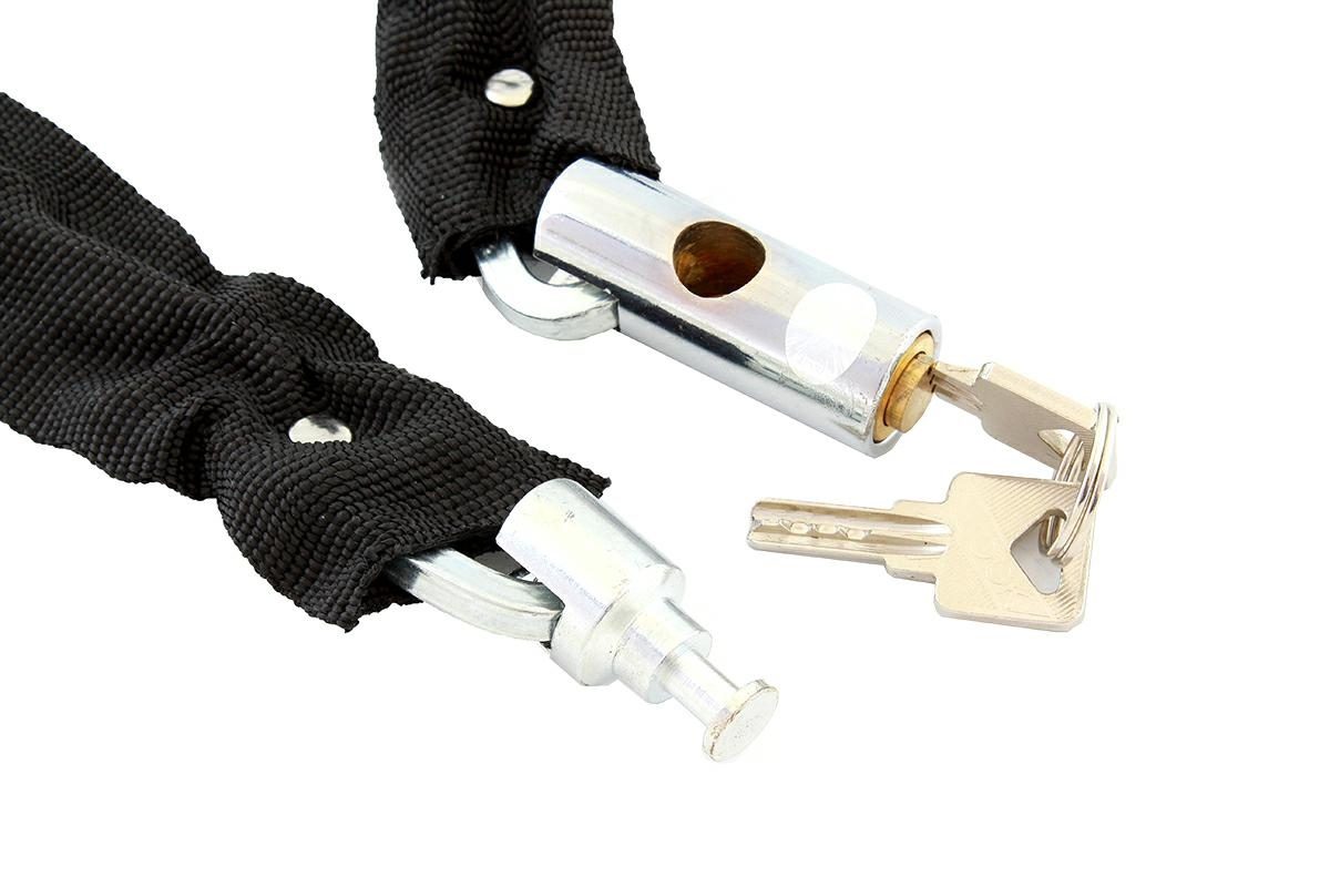 O încuietoare pentru biciclete / motociclete sub formă de lanț. Perfect pentru asigurarea cu două roți (motociclete, biciclete) împotriva furtului. Un lanț de oțel întărit într-o împletitură de nailon previne în mod eficient orice utilizare abuzivă a bicicletei. Încuietoarea din alamă împiedică deschiderea lanțului cu cheia greșită.