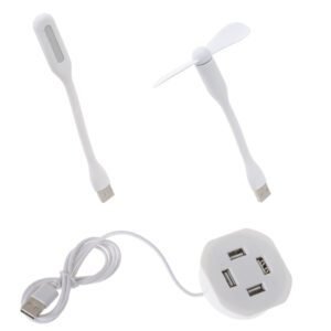 Setul include, de asemenea, un ventilator și o lampă – ambele articole au un conector USB pentru a le putea conecta la panoul USB.
