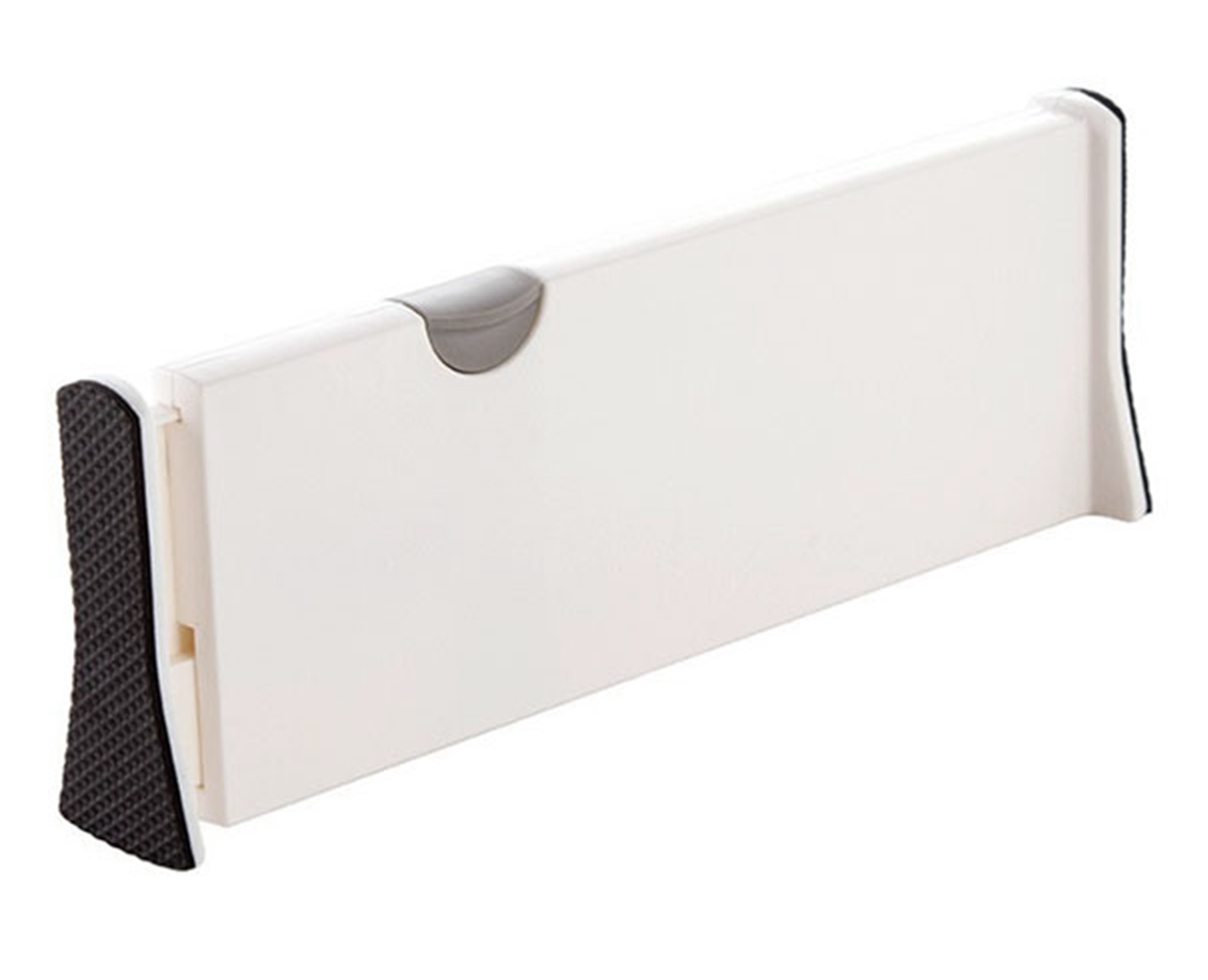 Organizator de sertar pliabil, extrem de practic. Despărțitorul vă permite să vă organizați colecția de produse cosmetice sau lenjerie intimă într-un mod simplu și ieftin, împărțind sertarul în două părți de orice dimensiune. Posibilitatea de pliere și desfacere a lățimii de la 28 cm la 43 cm împreună cu un mecanism solid de blocare permite separatorului să se potrivească perfect sertarului.