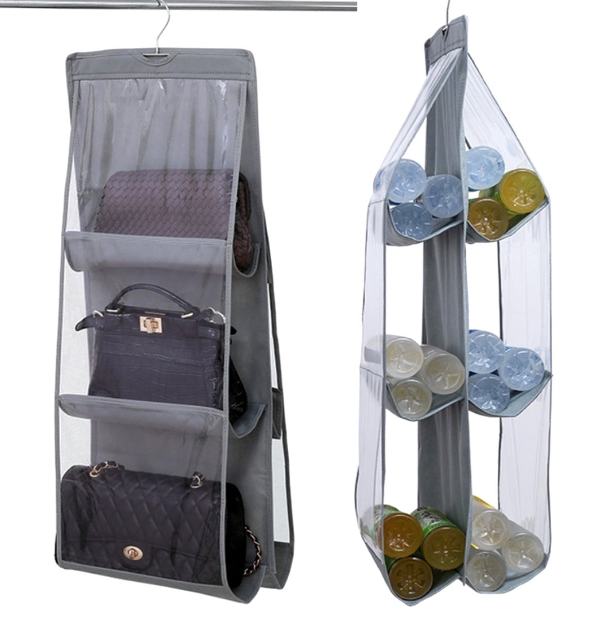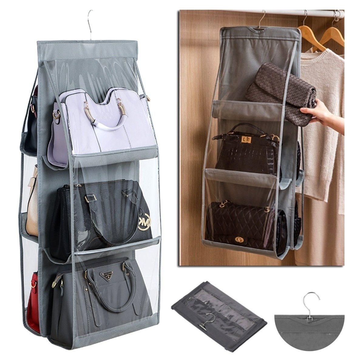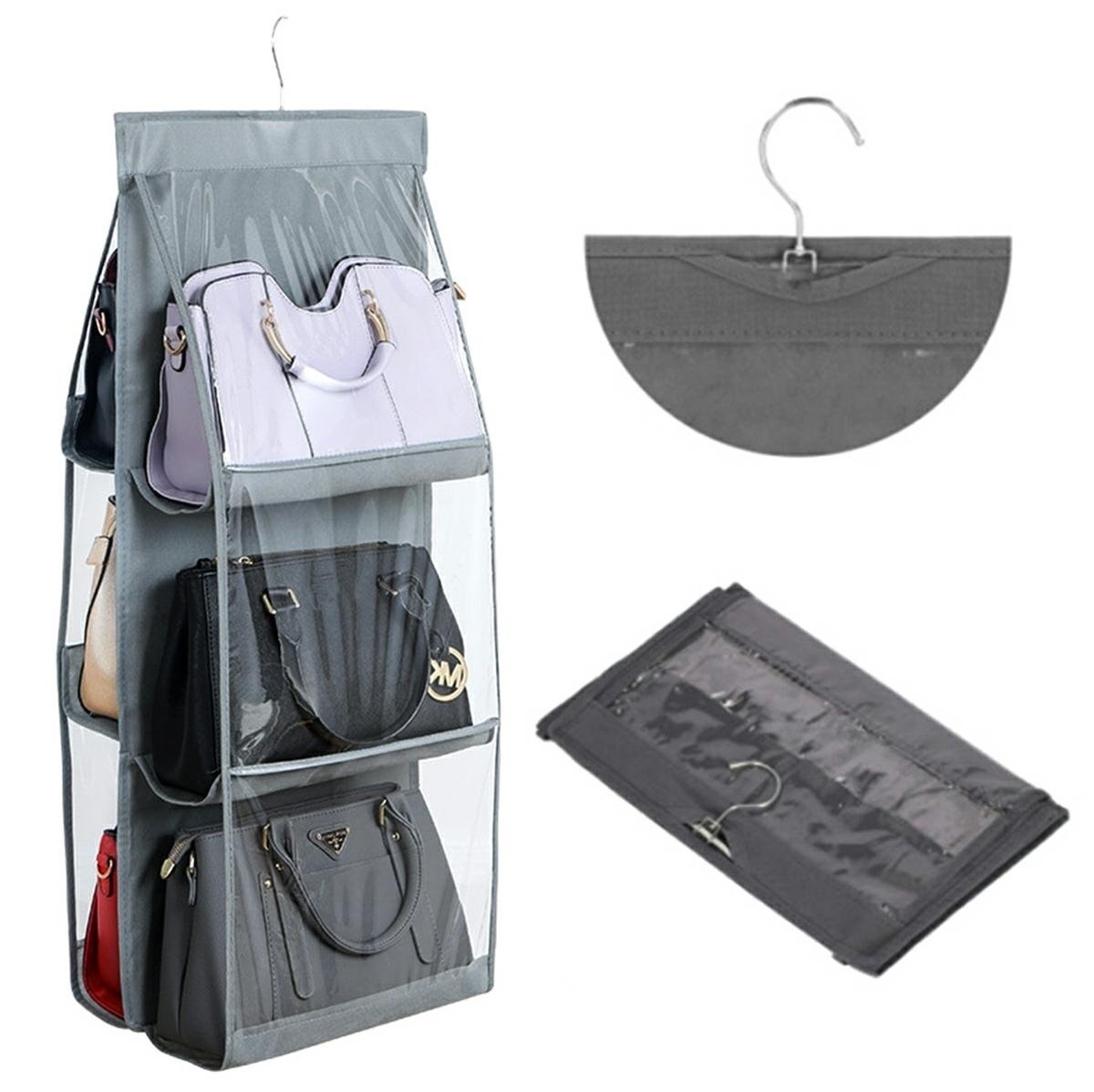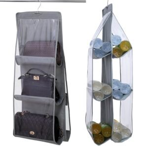 Organizator de agățat robust pentru genți de mână. Vă permite să atârnați până la 6 genti în același timp. Conceput pentru a fi montat într-un dulap (doar desfaceți-l și agățați-l în dulap folosind cuierul atașat). O modalitate excelentă de a economisi spațiu! Fabricat din plastic durabil, care garantează o utilizare îndelungată și fără probleme. Complet pliabil – ocupă puțin spațiu atunci când nu este utilizat.