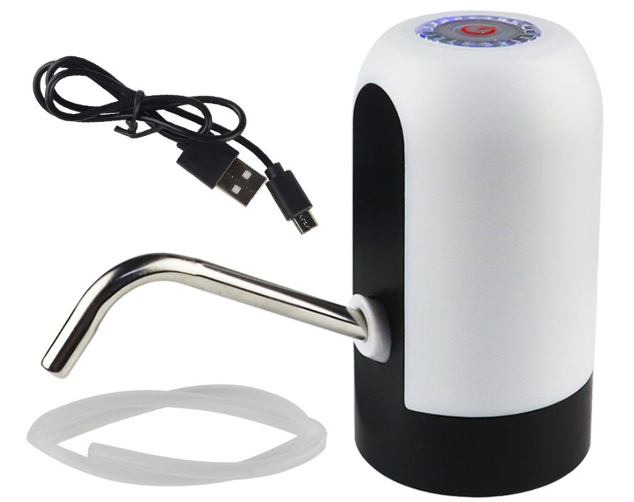 Pompa electrica de apa. Vă permite să turnați apă din sticle mari și incomode cu o capacitate mare în sticle sau vase mai compacte. Nu necesită alimentare de la rețea (bateria încorporată încărcată printr-un port USB standard). Dimensiunile compacte facilitează montarea dozatorului pe gura cilindrului. Tubul de oțel facilitează turnarea apei în pahare. Tubul lung de aspirație și performanța înaltă accelerează pomparea.