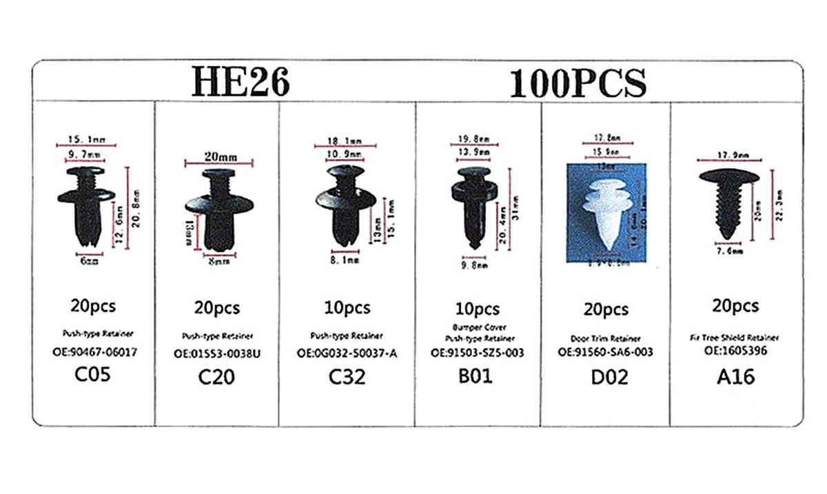 Set de 100 de clipsuri universale pentru mașină. Setul include 6 cele mai populare tipuri de cleme, sortate în 10 și 20 de bucăți. O carcasă convenabilă, compactă, cu compartimente, împiedică amestecarea elementelor setului. Toate camerele carcasei sunt semnate, ceea ce facilitează găsirea clemei potrivite.
