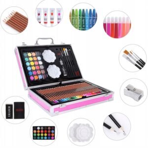 Setul nostru de artă are câte ceva pentru toată lumea – pixuri de colorat , creioane colorate și vopsele de pictură . Toate acestea în culori saturate care arată grozav pe hârtie. Totul este închis într-o valiză confortabilă care poate fi ușor pliată, închisă și luată cu tine – la școală , grădiniță, cursuri de artă sau într- o excursie pentru a picta în aer liber!