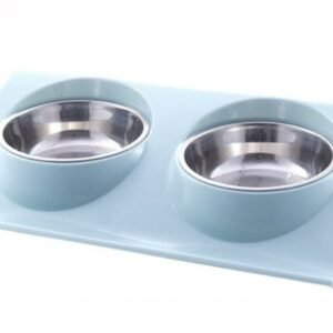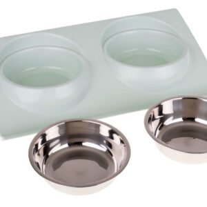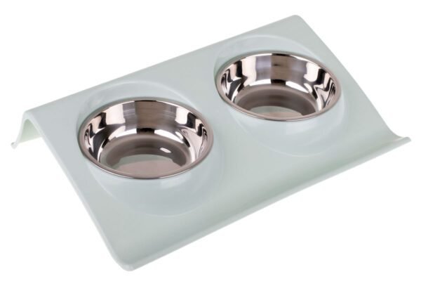 Două boluri pe o bază din plastic sunt un echipament elegant și funcțional pentru un apartament cu animale de companie.