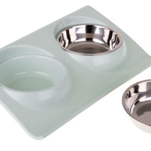 Baza din plastic rezistent a fost profilată în așa fel încât alimentele sau apa să nu ajungă pe podea, ci în jgheabul din față. Totul este ușor de curățat – bolurile pot fi îndepărtate cu ușurință, baza este suficientă pentru a șterge cu o cârpă umedă.