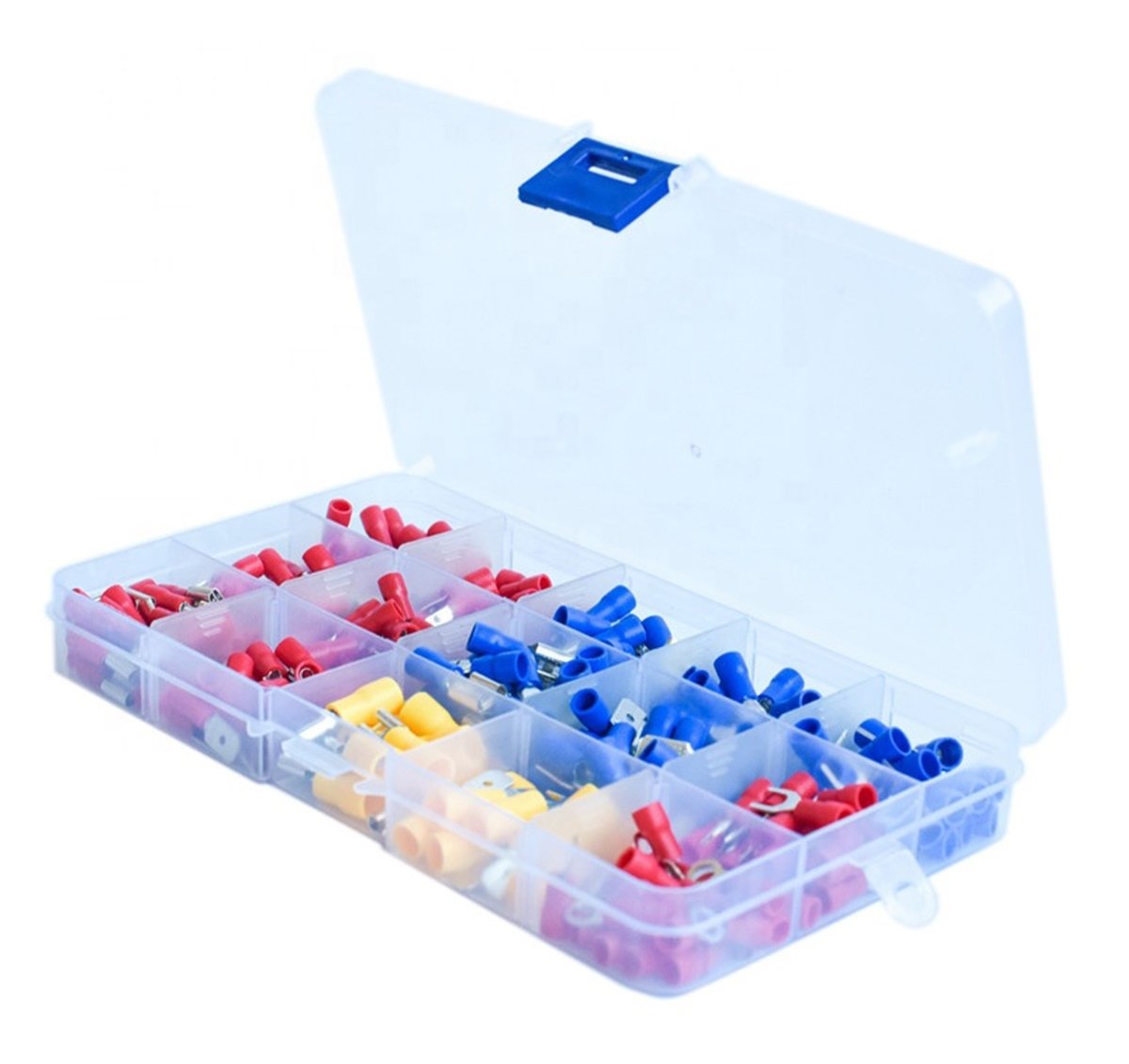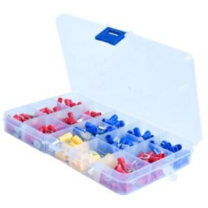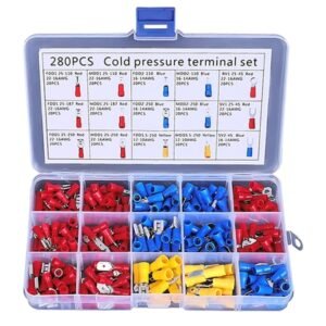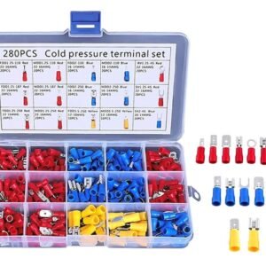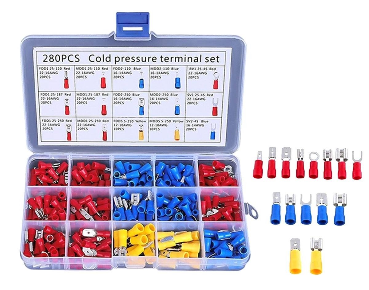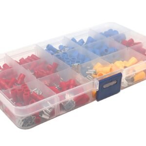 Set de 280 de conectori de sertizare izolați. Setul include 15 tipuri de conectori separați în camere separate. O carcasă convenabilă, compactă, cu compartimente, împiedică amestecarea șuruburilor. Toate camerele carcasei sunt semnate, ceea ce facilitează găsirea conectorului potrivit. Conectorii previn îndoirea excesivă a firelor și coroziunea acestora, asigură o bună izolare.