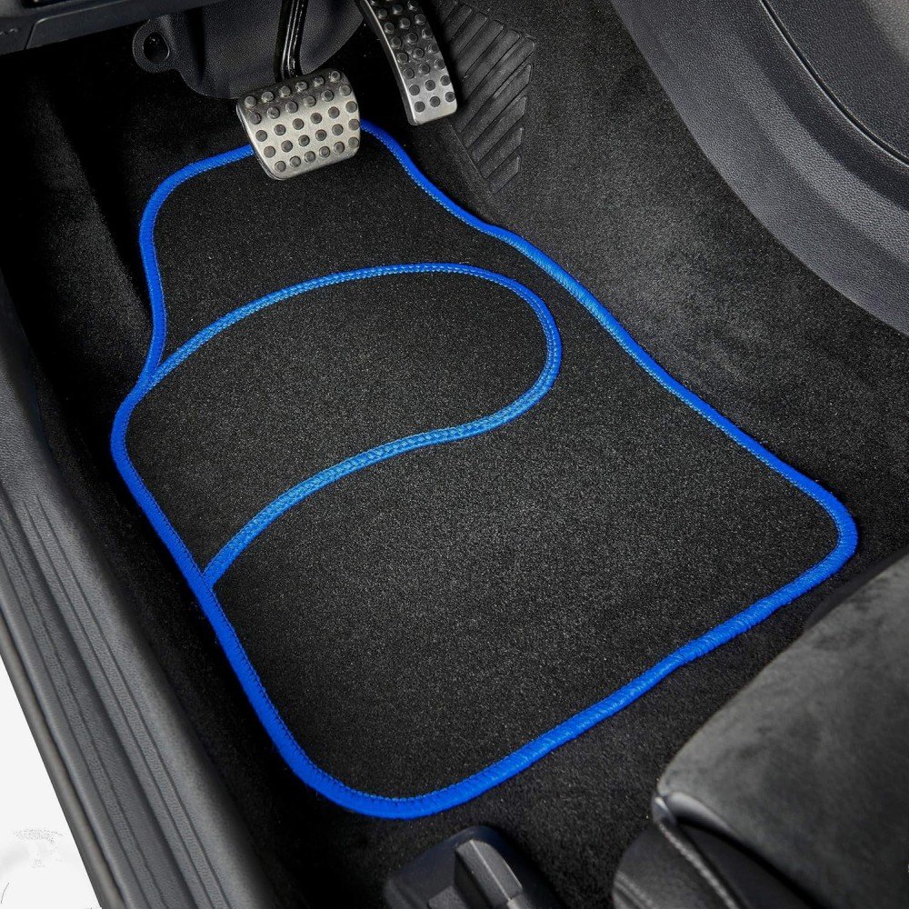 Set 4 Covorase auto din Mocheta, model Universal, culoare Negru cu margine Albastra, dimensiuni fata 64 x 44cm | spate 44 x 29cm