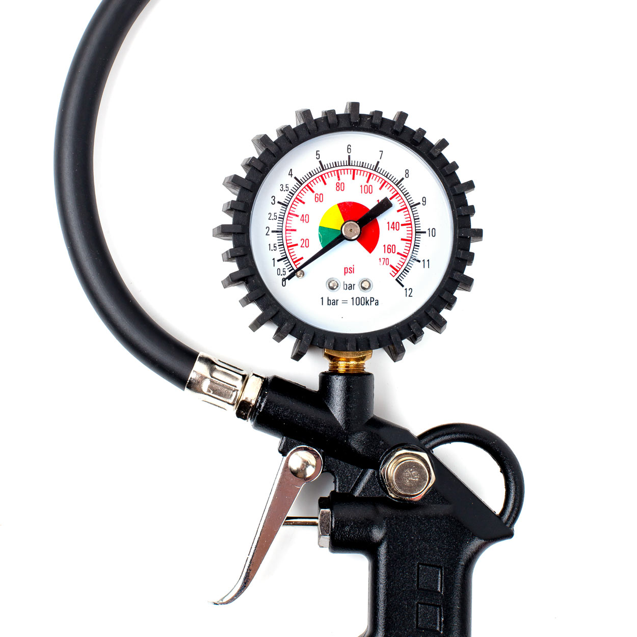 Un pistol pneumatic pentru umflarea roților cu un manometru este un instrument necesar în fiecare garaj. Pistolul este confortabil, usor, practic si realizat estetic. Pistolul are o supapă de eliberare a aerului și un capac de cauciuc pentru manometru.