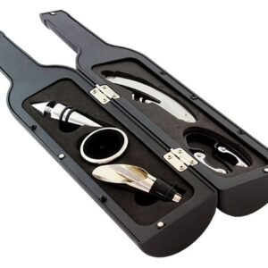 Un set bogat (6 bucăți) pentru vin ambalat într-o cutie estetică în formă de sticlă de vin. Cadoul perfect pentru orice amator mai mult sau mai puțin avansat de vinuri bune.