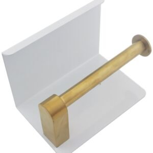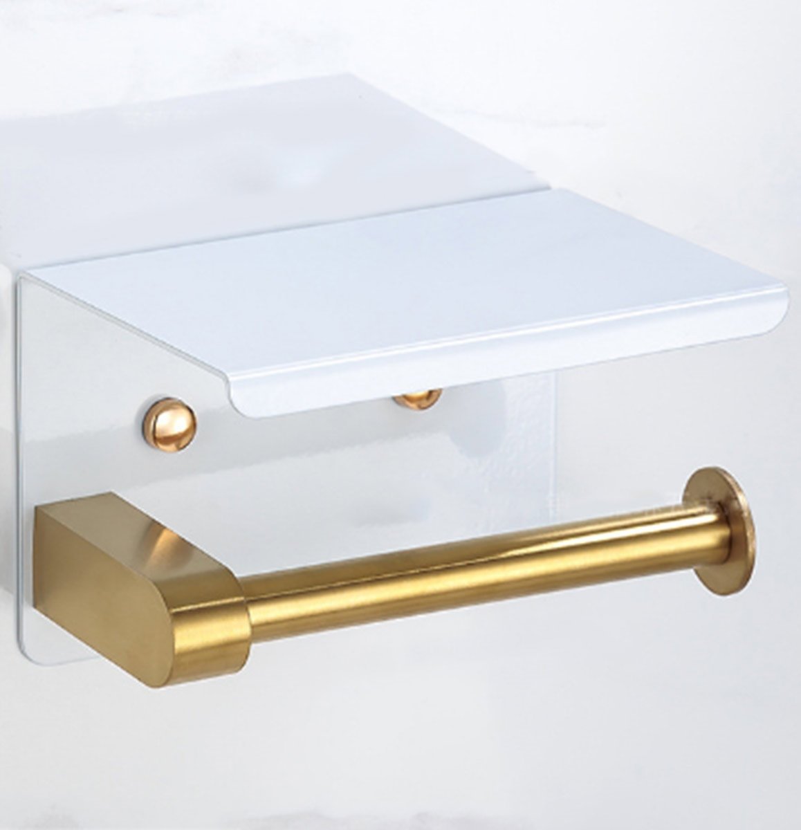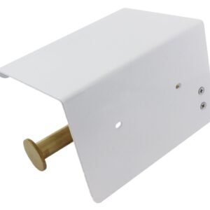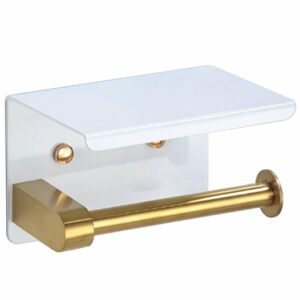 Suport pentru hartie igienica cu raft suplimentar, din otel, culoare alba cu brat auriu