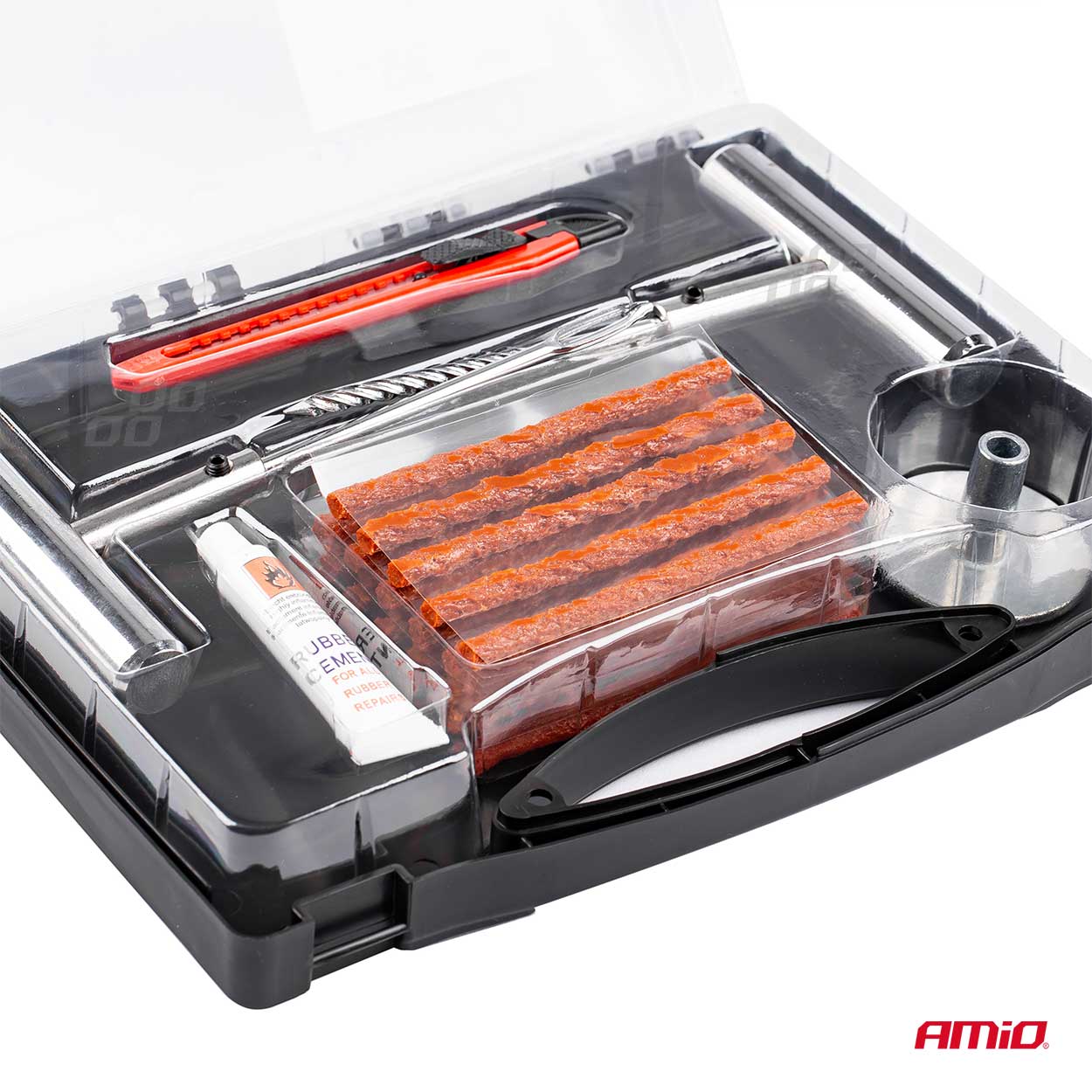Kit reparatie anvelope auto. Setul este ușor de utilizat și universal. Face posibilă repararea unei anvelope în câteva minute.
